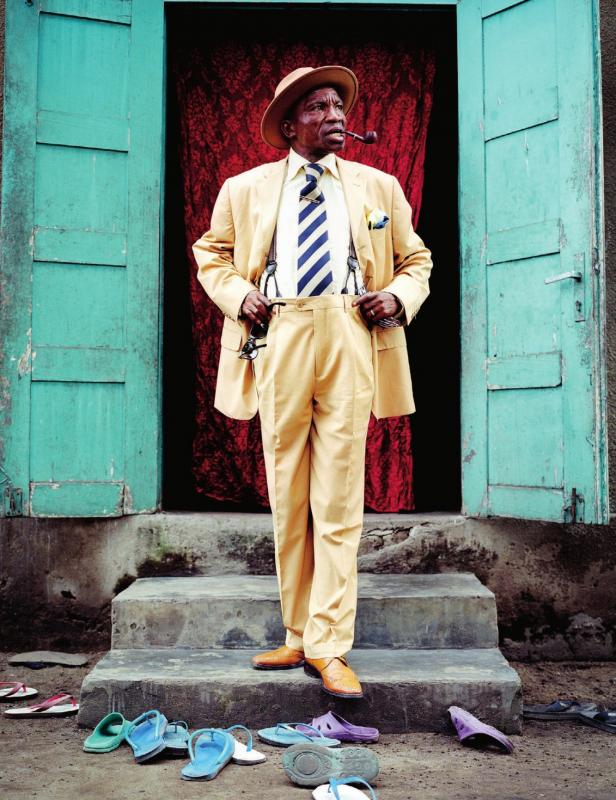 Mediavilla’s photographs show impeccably dressed African men wearing three-piece suits of bold colors and luxurious fabrics and often framed by a deteriorating urban landscape. “Hector talks about not using the same ‘pity narrative,’ but showing people fashioning themselves in different ways,” says Semley. Despite the difficult situation around them, these men are using clothing to elevate themselves above it.