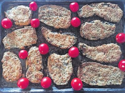 • When the sheet is filled with cutlets (don’t let any touch one another), bake at 400. After about 10 minutes, or when you smell browned toast, flip the cutlets. The bottoms cook faster, so if you are waiting for the tops to brown, the bottoms will burn. When slightly brown on both sides, remove the tray from the oven and allow to cool.