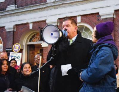 Groups such as 32BJ SEIU labor union, Fight for 15 Massachusetts, Haitian-Americans United Inc. (HAU), and the American Civil Liberties Union of Massachusetts were joined by Mayor Martin Walsh at Faneuil Hall Marketplace to share testimony and words of solidarity for Deferred Action for Childhood Arrivals and Temporary Protected Status recipients.