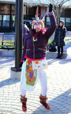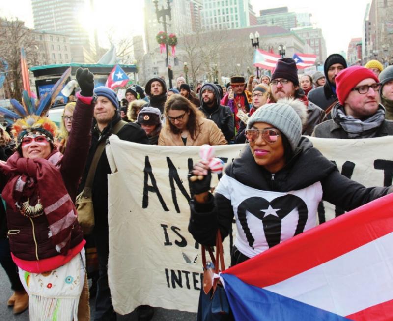 Ushering the crowd of singing and chanting activists, a pickup truck blasting music made its way down the street to Copley Square and arrived at its destination, Arlington Street Church, for a Bomba party, a traditional music style of Puerto Rico. All of the rally’s participants were invited to join the indoor gathering, a welcome reprieve from the 30-degree weather.