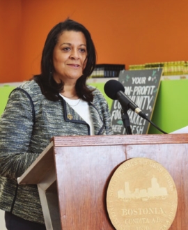 Jeanne Pinado, CEO of Madison Park Development Corporation, which owns the space on 2201 Washington Street where the new Daily Table store is located, offered remarks at the ribbon-cutting.