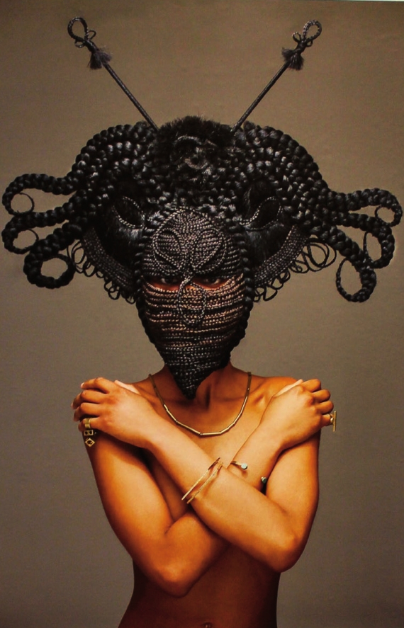 Directly across the room from the entrance is Nona Faustine’s “Over My Dead Body” from her 2013 “White Shoes” series. Faustine’s photograph features her from behind, nude except for a pair of white pumps, walking up the steps of the Tweed Courthouse in New York City. The courthouse was built on an African burial ground. Faustine carries a pair of shackles in her hand. The human body was the currency of slavery, and so Faustine’s body is at the heart of her work. Her nude state at once illustrates vulnerability and demands confrontation.