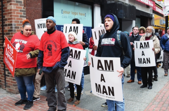 Fast food workers in Boston on Monday looked back at the historic accomplishments of sanitation workers who protested in Memphis 50 years ago, while fighting for a future that includes a minimum $15 wage and union representation.