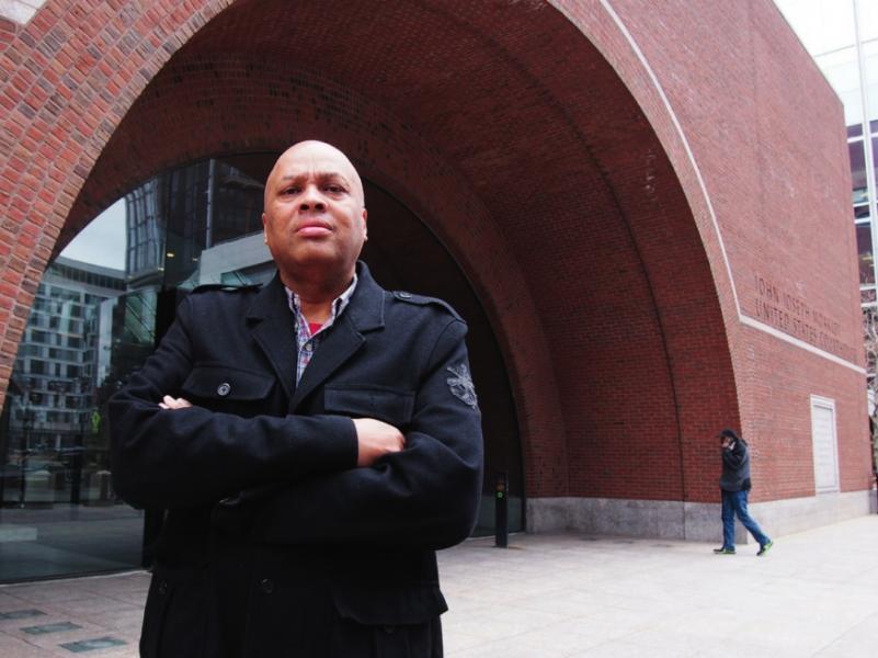 Larry Ellison, president of the Massachusetts Association of Minority Law Enforcement Officers, stands in front of the Moakley Courthouse.