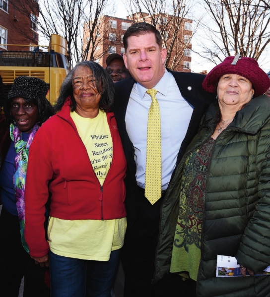 Mayor Martin Walsh celebrates with residents during Phase 1 of the Whittier Street public housing project breaks ground in Roxbury.