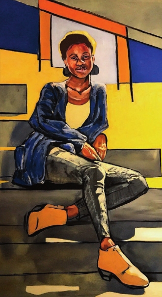 Tucker is a Boston native and has lived in Dorchester, Hyde Park and Mattapan. “Much of my perception of representation comes from what I’ve seen and heard here in Boston,” he says. His three large-scale portraits in the show depict female friends and family members in different styles. Tucker says he’s in an experimental period where he’s discovering different manipulations of paint and canvas to render his subjects.