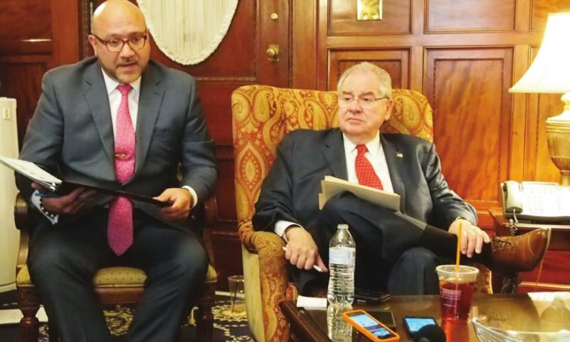BANNER PHOTO House Ways and Means Chairman Jeffrey Sanchez and House Speaker Robert DeLeo brief reporters on the fiscal year 2019 budget.