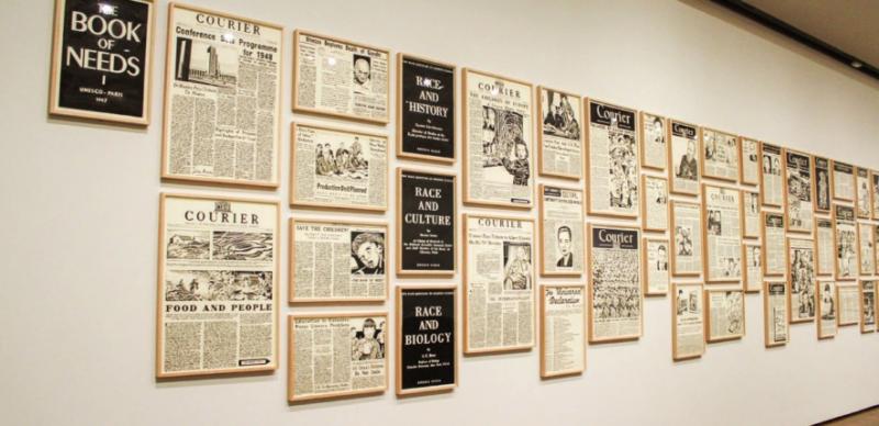 Three seminal issues of the Courier jump out at the viewer with white text on black pages. “Race and History,” “Race and Culture” and “Race and Biology” introduced topics of race to the journal in the 1950s. By placing these bold issues at the beginning of the exhibit, Bryce illustrates how racism, along with many other issues covered in the journal, is ongoing today.