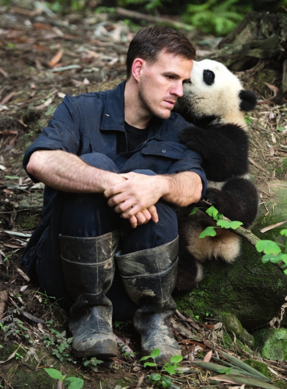 PHOTO: DREW FELLMAN Dr. Jake Owens, Ph.D. (wildlife conservation biologist) and a giant panda at Panda Valley in Dujiangyan, China as seen in the new film, “PANDAS,” an IMAX Entertainment and Warner Bros. Pictures release.