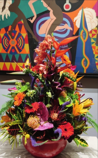 captured the exhilaration of the artist’s tribute to Baker with its bold patterns, sleek, minimalist dancing figures and exuberant, earth-toned palette. Bird of paradise, calla lilies, orchids, anthurium and other blossoms reflected the painting’s feast of color, and angular leaves echoed the strong lines in its African motifs.