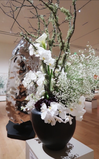 A gleaming tower of chromeplated stainless steel by Chinese artist Zhan Wang, “Artificial Rock #85” (2005) is a somewhat ironic take on a traditional Chinese scholar’s rock, a home-size meditative object that evokes the distorted formations in a mountain cliff. The Community Garden Club of Duxbury echoed the sculpture’s scale and grandeur in a delicate arrangement composed of flowers that a monk might find on a mountain path. Moss-covered branches extended its height, and sprigs of small buds translated the sculpture’s bulk into an airy equivalent.