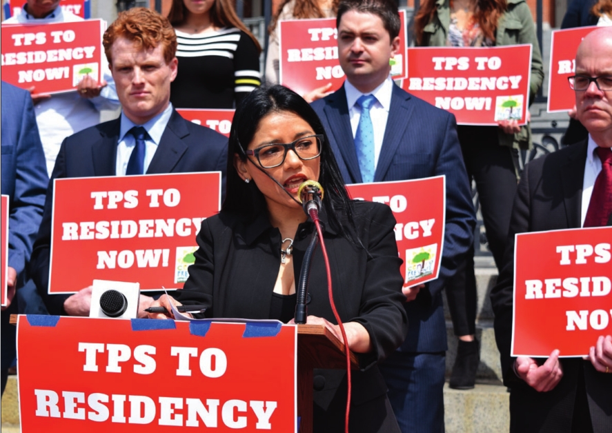 As she spoke, behind her stood TPS supporters, including U.S. Rep. Joe Kennedy III and U.S. Rep. Jim McGovern, who helped draft TPS legislation in 1990 with the late Rep. Joe Moakley.