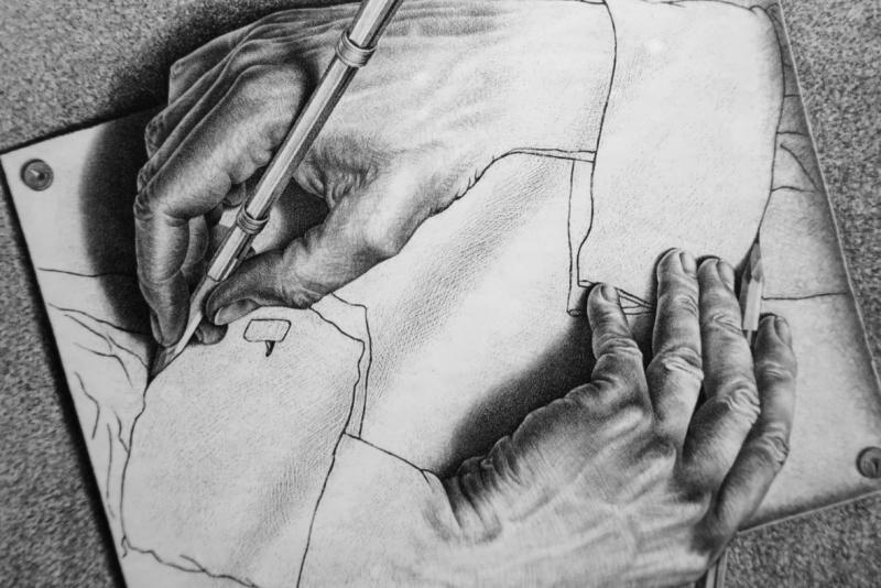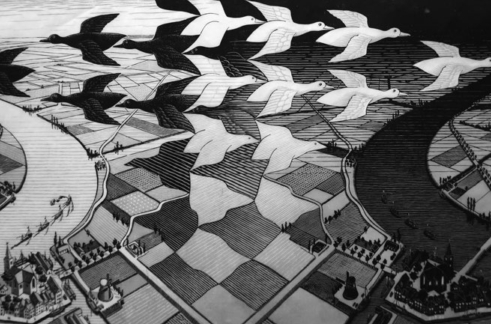 (from top) M.C. Escher, “Drawing Hands” (1948); M.C. Escher, “Day and Night” (1938); M.C. Escher, “Puddle” (1952)