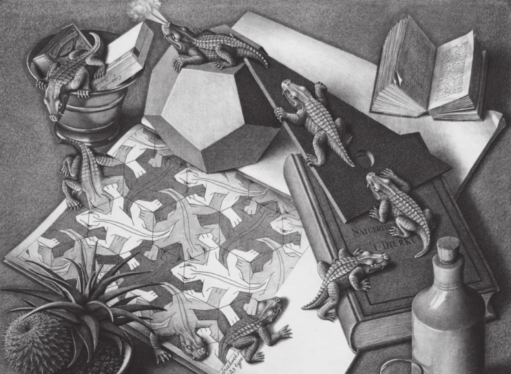 Escher’s narratives are endless, repetitive loops that keep going without stopping or leading anywhere — like a spinning hula-hoop, but unlike life. In “Reptiles,” the print borrowed by Mott the Hoople, a two-dimensional lizard wriggles out of a drawing as a three-dimensional figure, scales a zoology book and a polyhedron-shaped desk ornament, snorts in triumph, and then heads downhill to rejoin the drawing.