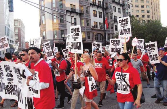 “If there is a strike, it’s going to be one like the city has never seen,” Lang said, as the crowd of labor activists chanted “Strike, strike, strike!” “We’re not just hotel workers,” Lang continued. “We are service workers, like SEIU. We are the health care workers who work two jobs when one job should be enough.”