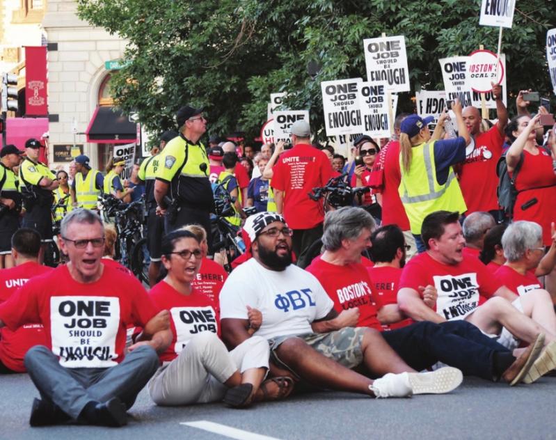 Unite Here Local 26 President Brian Lang (left) joins hotel workers in a sit-in demonstration on Huntington Avenue. No arrests were made.