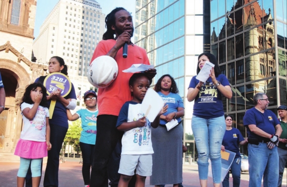 Sprinkler Fitters union member Chaton Green speaks during a rally in Copley Square.