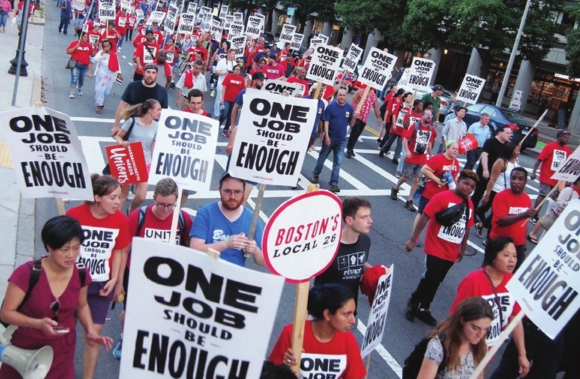 The hotel workers were joined by a coalition of labor groups, including SEIU 615, building trades workers, Boston Teachers Union members and others who had gathered for a rally in Copley Square. Many carried signs with the hotel workers’ slogan, “One job should be enough.”