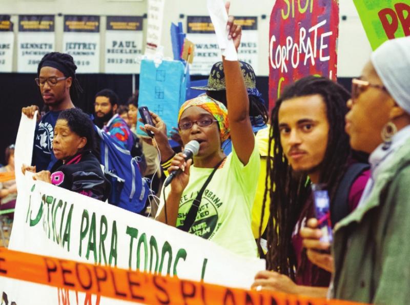 City Life/Vida Urbana Executive Director leads demonstrators at the YIMBY Conference, held at Roxbury Community College.