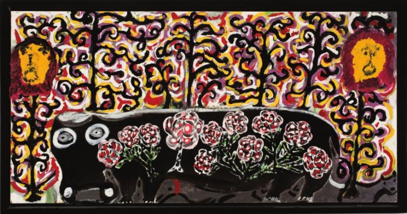 Andrew and Linda Safran’s interest in American outsider art began with their acquisition of William L. Hawkins’ painting “Hippo” in 1989. It was the “simplicity and the vibrancy” of the large-scale image — a black hippo painted against a striking red background — that first appealed to them. It made them “feel happy without feeling compelled to search for hidden meaning and intent,” wrote Linda Safran via email.