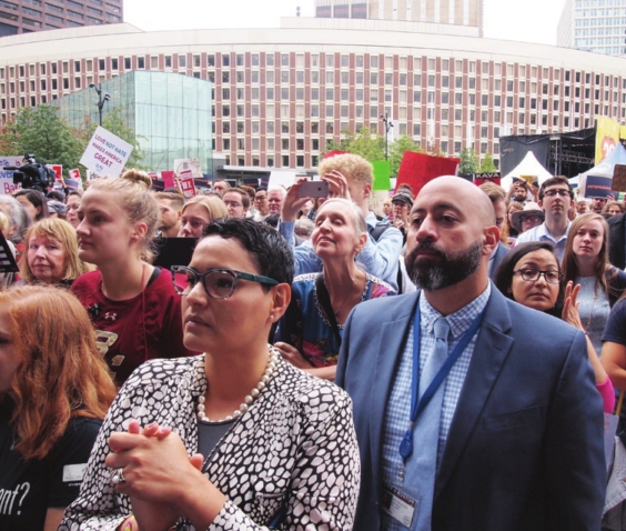 The speakers and the chanting crowd seemed determined not to let the Republican senator leave Boston without hearing their message. “Let’s raise our voices to be heard and say, ‘no more,’” said Democratic gubernatorial nominee, Jay Gonzalez, who spoke during the rally.