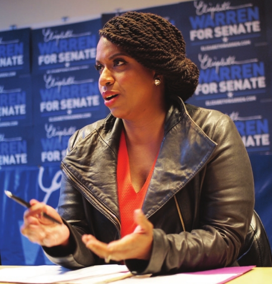 Ayanna Pressley speaks to reporters at the Massachusetts Democratic Party’s coordinated campaign office in Dorchester.