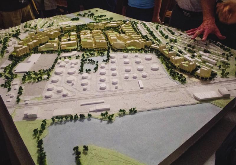 A scale model of the Suffolk Downs redevelopment plan presented at the first neighborhood-wide public meeting on Tuesday night (Oct. 2) in East Boston