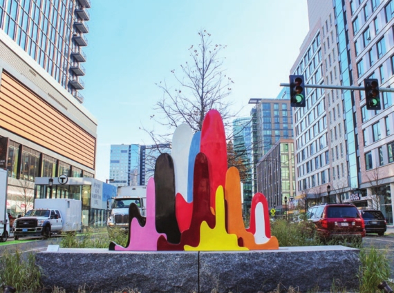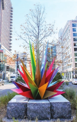 The piece also references the Prudential Center here in Boston. Sometimes referred to as Boston’s “North Star” that guides people downtown, the Pru glitters different colors for special occasions and sports games. The next Seaport installation sculpture, “Creation: