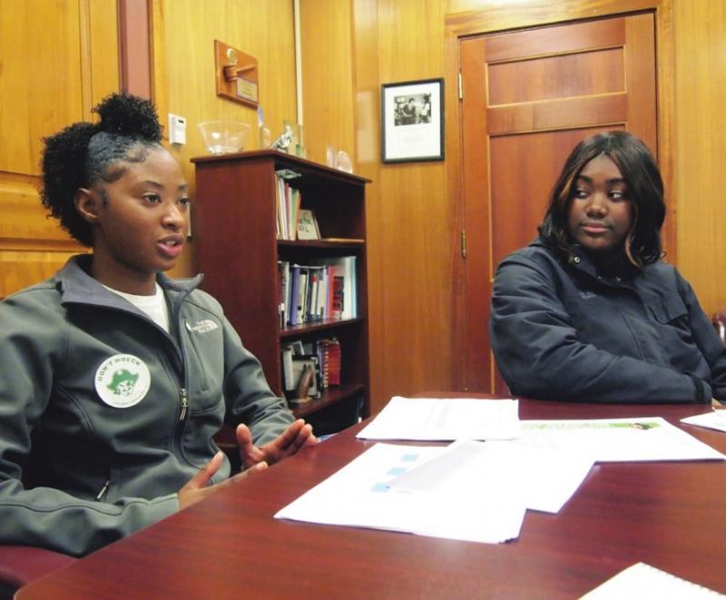 Roxbury Academy students Aysha Correia and Dionna Alexis speak with