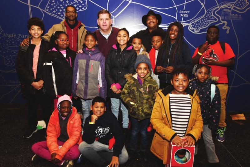 Mayor Martin Walsh stops by the Bolling Building in Roxbury during the Mayor’s Holiday Trolley Tour.