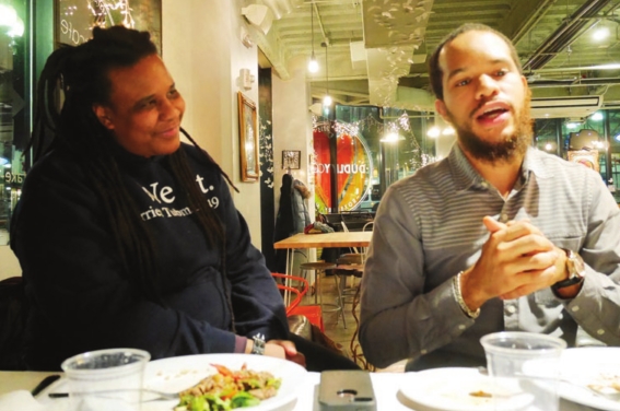 Boston Ujima Project Executive Director Nia Evans looks on while Ujima member Darris Jordan (r) speaks at a Dec. 13 press event for the Ujima Fund launch.
