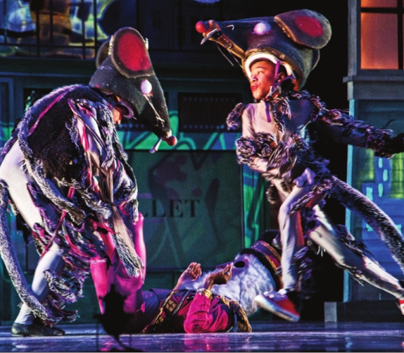 Kyre Ambrose as a rat, Sophia Garufi as a rat, and Ronnie Thomas as the Nutcracker Prince in “The Urban Nutcracker.”