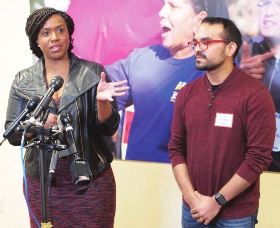 U.S. Rep. Ayanna Pressley and American Federation of Government Employees Vice President Sajid Shahriar speak to reporters.