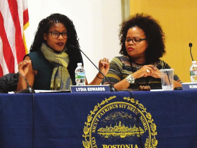 City Councilors Lydia Edwards and Kim Janey at a November 2018 hearing on displacement in Roxbury.
