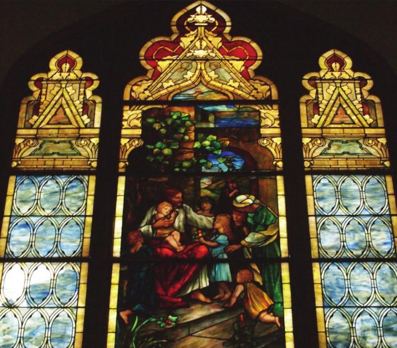Stained glass windows in the sanctuary of the St. James Church building don’t let in much light, but cannot be removed, due to the historic nature of the building.