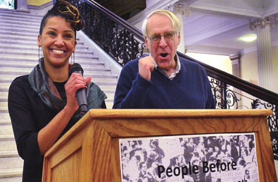 Karilyn Crockett, author of “People Before Highways” and Lew Finfer celebrate the stop of an interstate highway through Boston by a coalition of urban and suburban residents, planners and activists 50 years ago. They were joined by many from that era and Boston community residents at the State House.