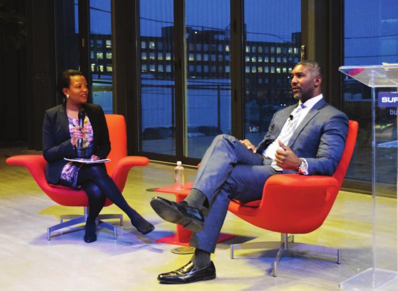 Suffolk Construction Vice President Linda Dorcena Forry and State Street Chief Diversity Officer Paul Francisco host a forum at Suffolk’s Roxbury headquarters.
