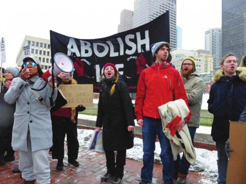 Nilaya, an organizer with the International Socialist Organization, leads protestors in a chant. A crowd of several hundred protesters turned out Monday to demonstrate against President Donald Trump’s planned declaration of a state of emergency, his calls to construct a wall on the U.S.-Mexico border and the continued deportation of undocumented immigrants.