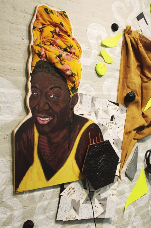 For “ENIGMA” Thervil painted portraits of millennials of color who work in or with nonprofits in Boston. These portraits are at the center of each installation. They pop off the wall out at the viewer, not just by virtue of being painted on wood, but because of the dynamism captured in each subject. Thervil says she photographs her subjects while they’re talking to capture unique moments of expression, and that movement is skillfully rendered in the final portrait.