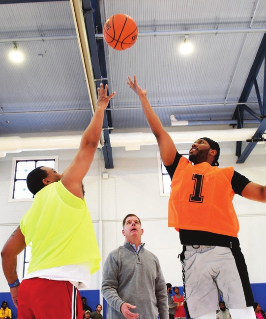 Mayor Martin Walsh initiates the tip off during the Carter Woodson Basketball Tournament at the Vine Street Community Center.