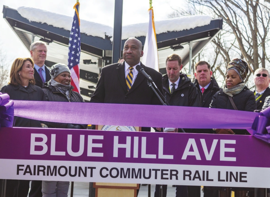 While trains on the Fairmount Line actually began stopping at the station, located between Cummins Highway and Blue Hill Avenue, on Feb. 25, a ribbon-cutting ceremony to commemorate the historical opening was held on Wednesday, March 6.
