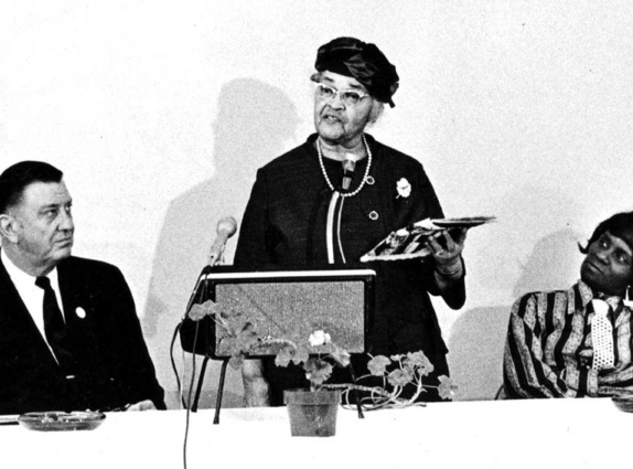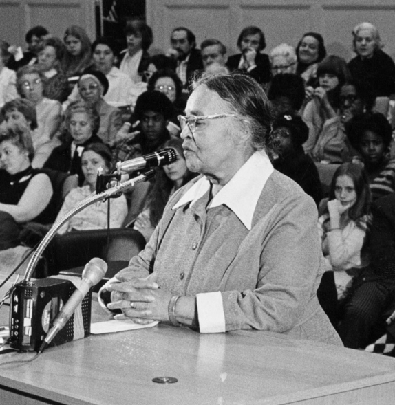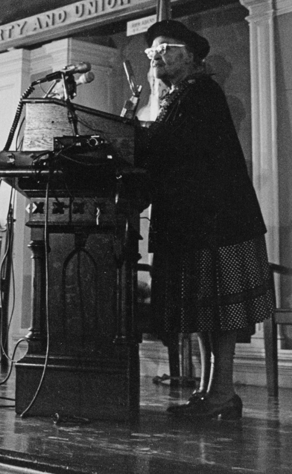 Melnea Cass speaks during a 1974 conference on inflation at Faneuil Hall.