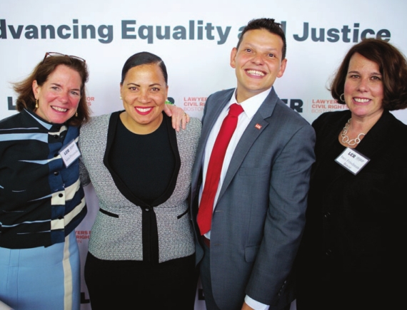 (left to right): Lisa Pirozzolo (partner at WilmerHale and LCR board co-chair), Suffolk County DA Rachael Rollins (keynote speaker), Iván Espinoza-Madrigal (executive director of Lawyers for Civil Rights), and Inez Friedman- Boyce (partner at Goodwin and LCR Board Co-Chair)
