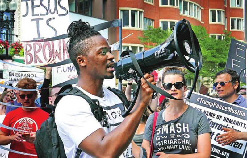 Martin Henson, representing “Black Lives Matter” addressed the crowd of approximately 300 protesters at the “Boston March Against Cages” pro-immigration, anti-ICE rally, August 4. The march began in Copley Square and ended at the Hynes Convetion Center where the American Correctional Association was holding its annual conference. See also