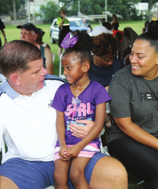 Mayor Martin Walsh and Suffolk County District Attorney Rachael Rollins attend the Scoops N’ Hoops Family Fun Day at Walker Playground.