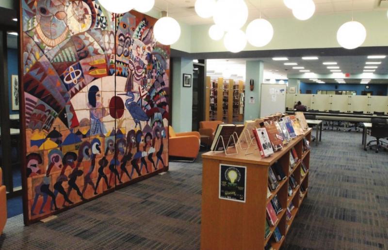 The newly-renovated library at RCC retains an installation by Roxbury artist Napoleon Jones-Henderson.