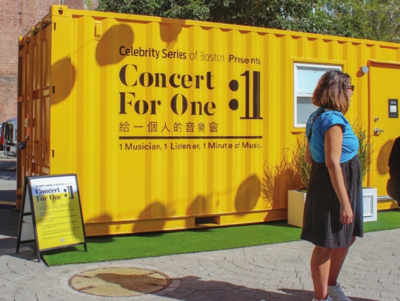 In Chinatown’s Chin Park on the Rose Kennedy Greenway, a bright yellow shipping container has appeared nestled among chessboards and strings of paper lanterns near the Chinatown Gate. As neighbors draw closer to the structure, notes of a melody waft from its metal walls. Inside sits a single musician, pouring their heart and soul into the performance. Across from the performer sits an audience of one. And that one could be you.
