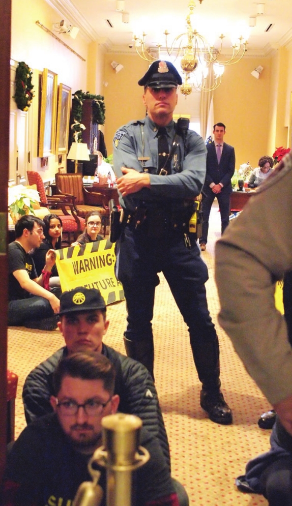 A group of 27 activists affiliated with the Sunrise Movement, who sat in at Gov. Charlie Baker’s office, were arrested after they refused to leave after 5 p.m.