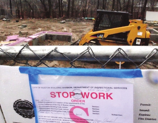 Last week, as the developers poured the foundation for a second condo building, this one with 11 units, city officials posted a stop-work order on the fence surrounding the site, shutting down the project until the city’s legal department reviews an assortment of complaints the neighbors raised during a meeting on the projects at the Zoning Board of Appeal.