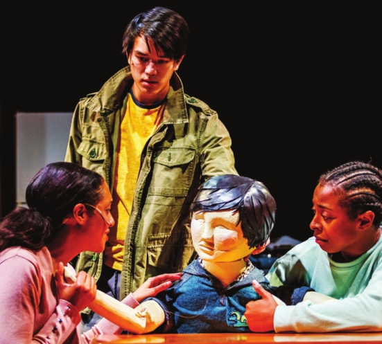 Though her wife Ash hasn’t fully consented, Robin is desperate to adopt a baby — desperate enough to engage in an under-the-table adoption, via the internet, of an 8-year-old Korean boy. This process, known as re-homing, is a very real measure often used to bypass the high financial cost of adoption or barriers for same sex-couples or single parents. The boy’s name is Jeenu, and his boy self is represented by a life-size puppet. The hilarious and energetic actor Minh-Anh Day narrates the boy’s inner dialogue, in which he sees himself as a lone wolf searching for a pack.